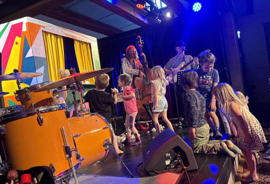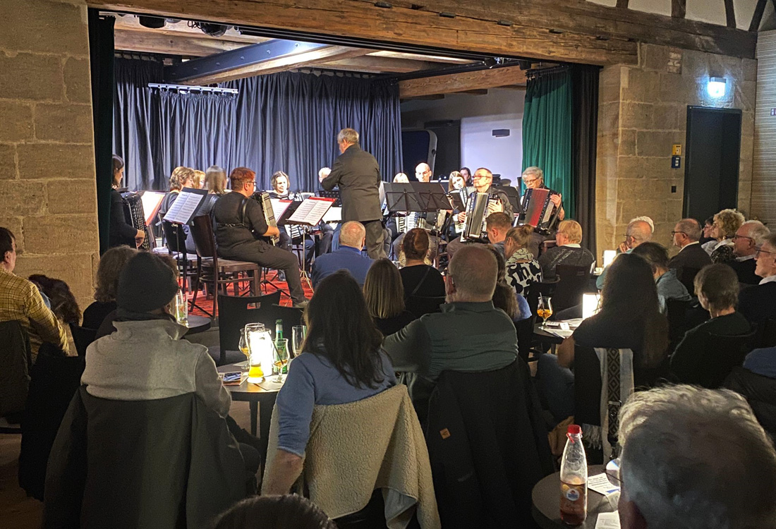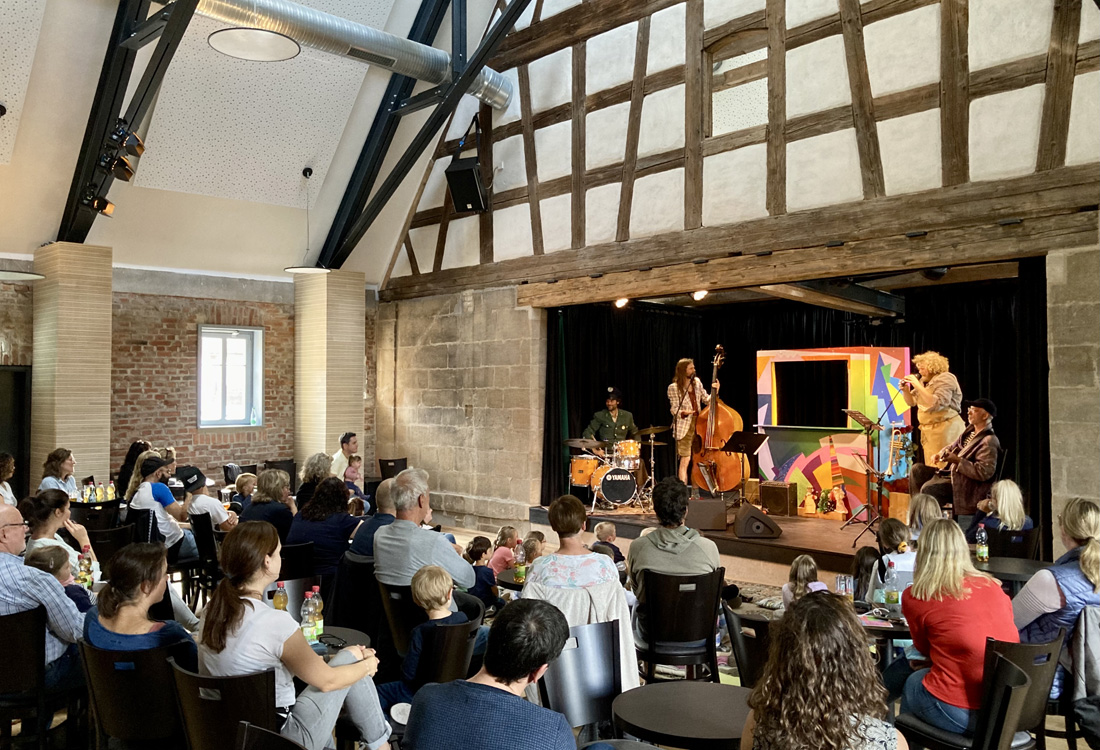Großen Anteil am besonderen Charme dieses Veranstaltungsortes hat die außergewöhnliche Deckenbeleuchtung und das Fachwerk über der Bühne – glücklicherweise wurde es bei einem früheren Anbau nicht zerstört.